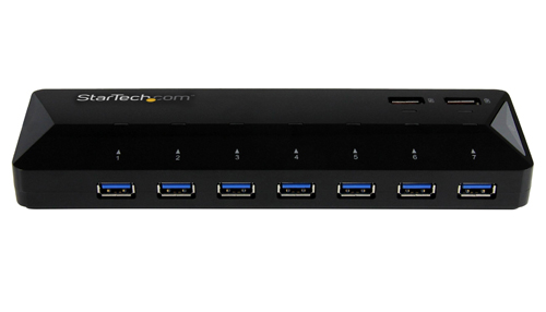Use this 7-port USB hub with 2 fast charge ports to connect to the USB devices at your desk and fast charge your phone or tablet.